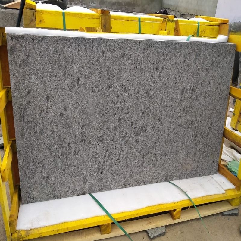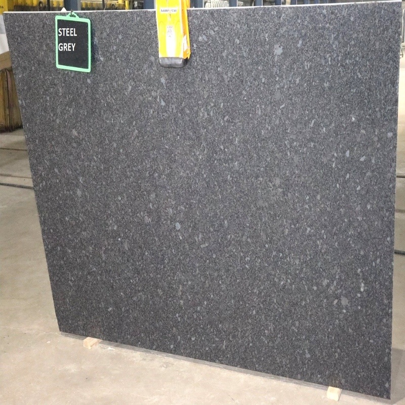 Steel Grey granite tiles feature a smooth grey base with subtle patterns, offering a modern and sophisticated look. These tiles are perfect for contemporary interiors and exterior applications due to their durability and low maintenance.
